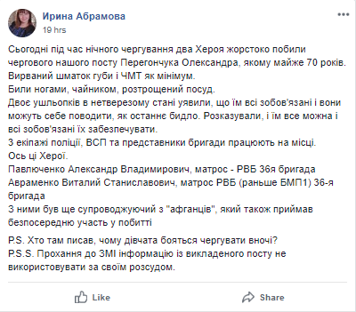 Волонтер Ирина Абрамова сообщила 4 июня в Facebook, что военные избили пожилого дежурного Александра Перегончука.