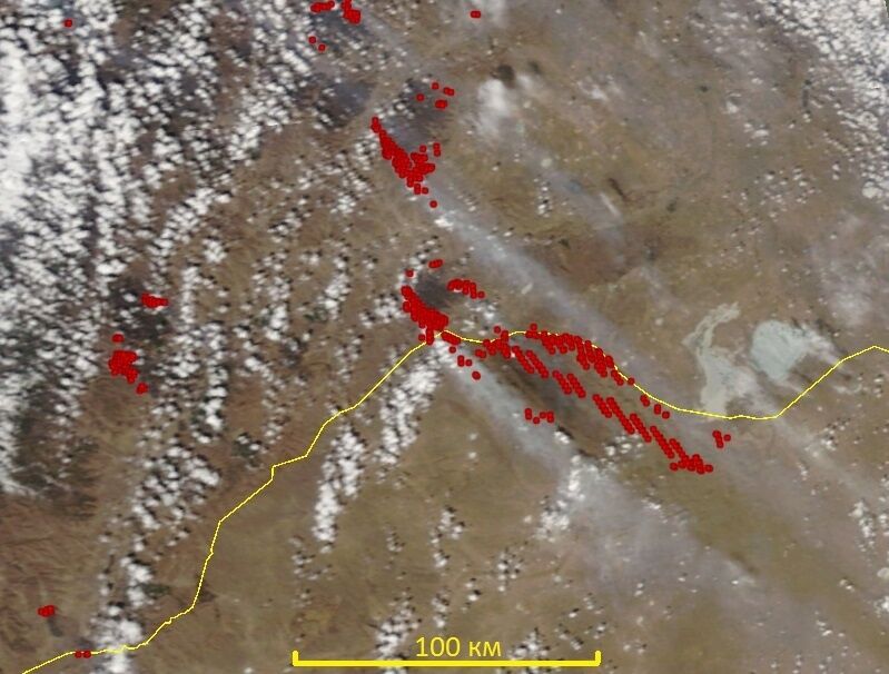 Он привел снимок спутниковой системы Terra MODIS от 19 апреля с термоточками, на котором видно, что огнем охвачены степи по обеим сторонам границы.