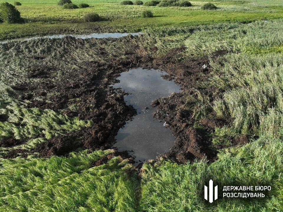 Самолет упал на безлюдную территорию и утонул в затопленной воронке среди болотистой местности.