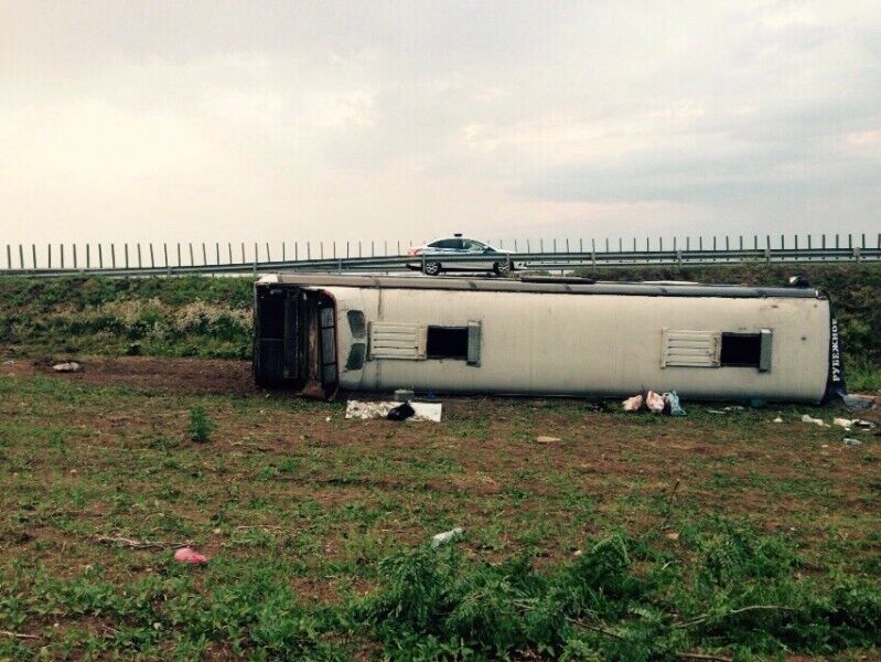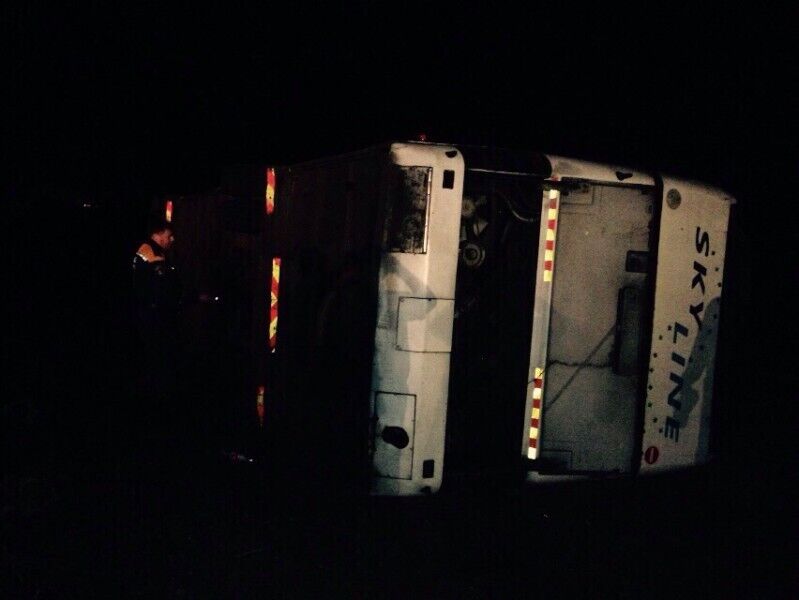 "По предварительной информации, водитель заснул и допустил съезд с дорожного полотна и опрокидывание автобуса Neoplan, двигающегося из города Краснодар", – сказано в сообщении.