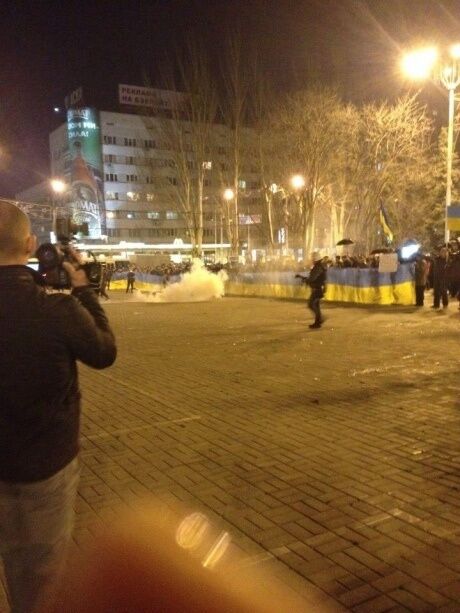 Милиция попыталась задержать нескольких агрессивных пророссийских активистов, но отступила под натиском толпы. Со стороны антиукраинского митинга слышались выкрики "На колени!". Позже сепаратисты начали громить автобусы милиции, чтобы помешать правоохранителям организовать отход проукраинских митингующих. В одном из автобусов выбили стекла, закинули туда петарды и слезоточивый газ.