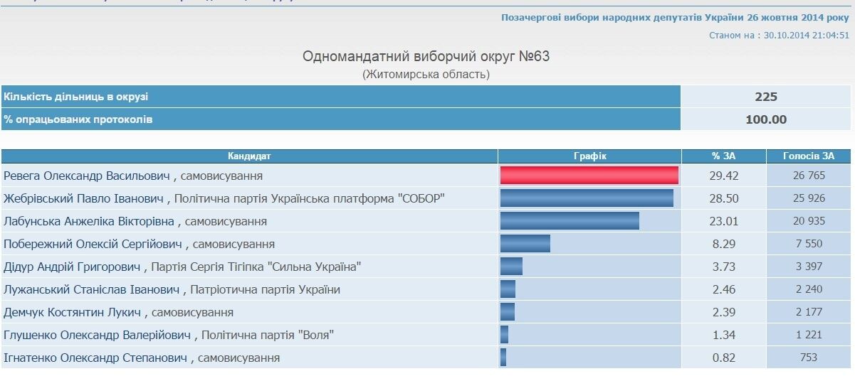 По состоянию на 30 октября Центризбирком обработал 100% электронных протоколов в округе №63. Лидирует здесь самовыдвиженец, бывший регионал Александр Ревега, который набрал 29,42%, на втором месте – кандидат от партии "Собор" Павел Жебривский (28,50%)
