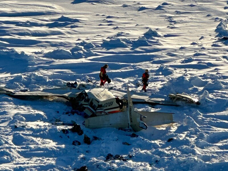 На фотографии, опубликованной береговой охраной, видно, что самолет разбился на части на заснеженной местности.