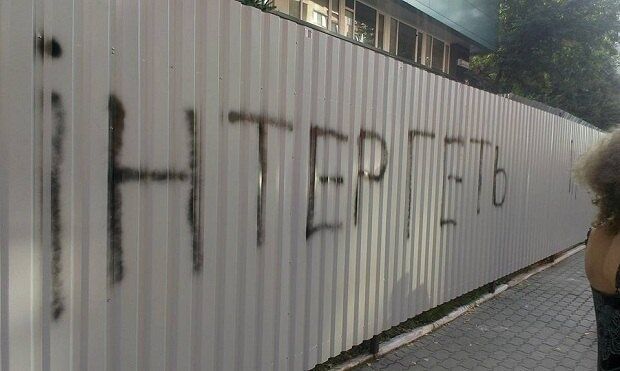 Издание пишет, что возле здания начали собираться активисты. Несколько человек написали на заборе краской "Інтер геть".