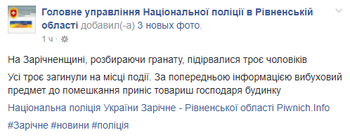 Взрыв в поселке Заречное в Ровенской области произошел из-за того, что трое мужчин пытались разобрать гранату, сообщили в областном управлении Национальной полиции в Facebook.