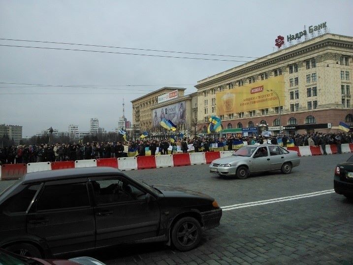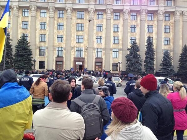 12.20 Несмотря на разблокирование Харьковской ОГА, на площади перед зданием продолжают оставаться сторонники единства Украины.