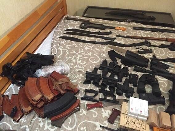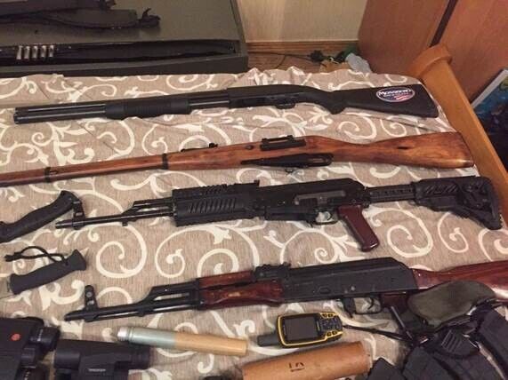 При обысках изъяты четыре мины МОН-50, 67 гранат, четыре гранатомета РПГ-22, три автомата Калашникова, винтовка Мосина, дробовик Mossberg, более двух килограмм тротила в шашках, 18 электродетонаторов, приборы ночного видения, оптические прицелы, бинокли, дальномер, более пяти тысяч патронов разных калибров, холодное оружие, глушители и магазины к автоматам.