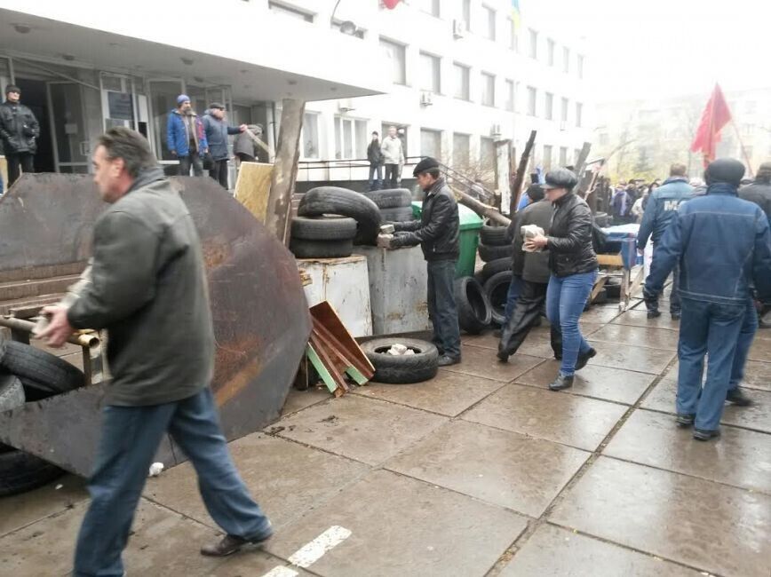 Здание Мариупольского горсовета захвачено сепаратистами, перед входом в здание около тысячи человек начали сооружать баррикаду из тротуарных плит, мебели, шин и досок.