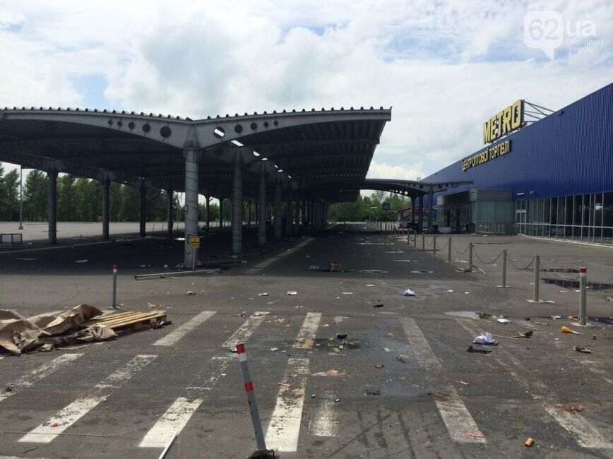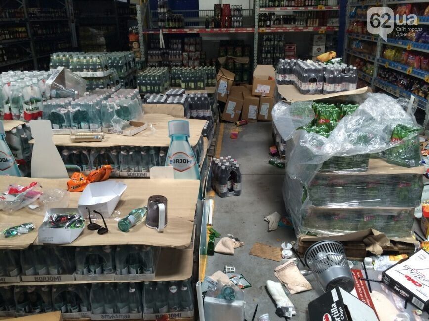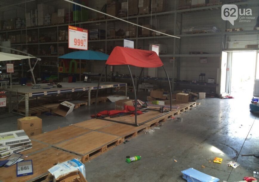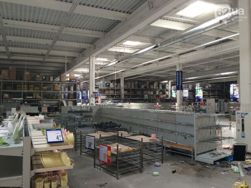 Магазин попал в зону военных действий возле аэропорта, отделы бытовой техники, одежды и элитного алкоголя опустошены. Людей не пугают выстрелы, которые звучат совсем близко, многие приходят "отовариться" семьями. Обочины на пути к супермаркету усеяны бутылками от спиртных напитков. Некоторые мародеры остаются ночевать в торговом центре, потому что из-за опьянения не могут добраться домой, сообщает портал 62.ua.