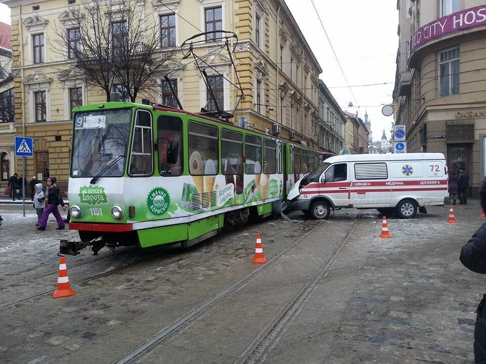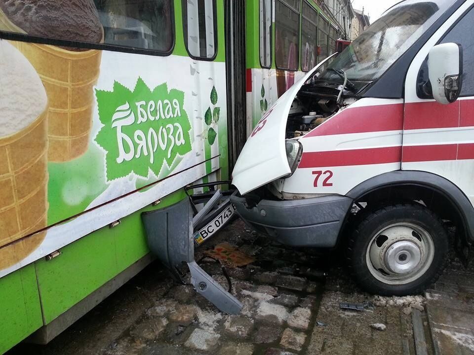 В центре Львова машина скорой помощи въехала в трамвай, есть пострадавшие