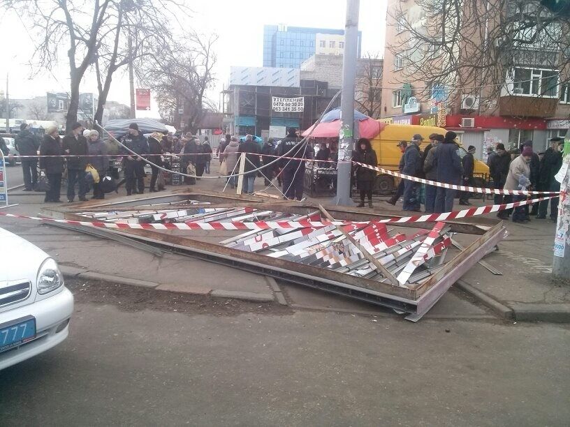 В Черкасах в воскресенье, 6 декабря, семь человек попали в больницу, после того как на них упала рекламная конструкция, сообщила Госслужба по чрезвычайным ситуациям. Щит размером 6,2х3,2 м упал с металлического столба предположительно от порыва ветра.