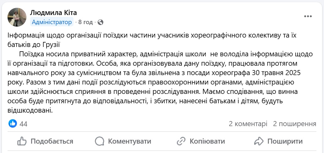 "Лицо, которое организовывало данную поездку, работало в течение учебного года по совместительству и было уволено с должности хореографа 30 мая 2025 года", – отметила Кита.