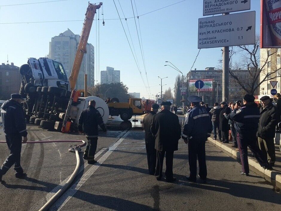 Днем во вторник, 28 октября, на проспекте Победы в Киеве вблизи станции метро "Святошин" перевернулась автоцистерна с подсолнечным маслом.