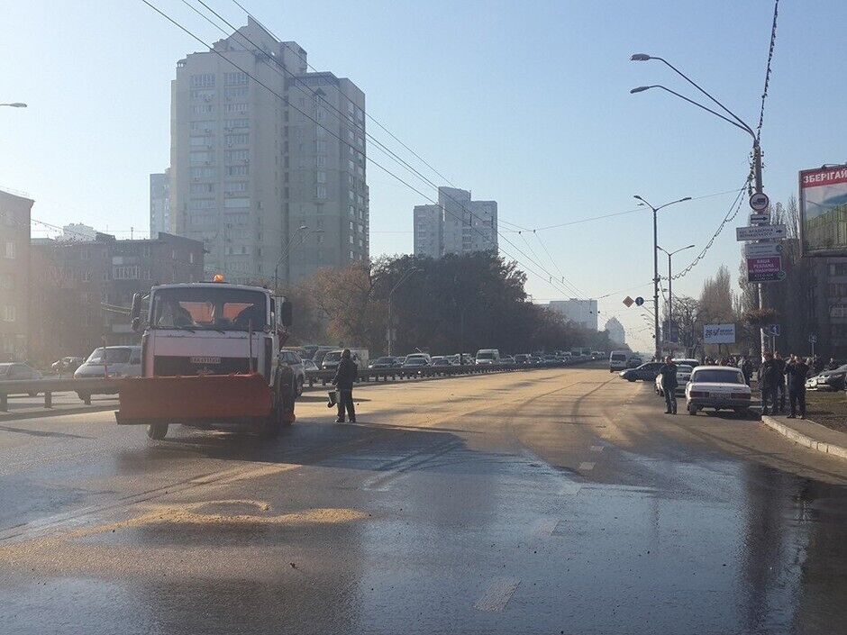 В результате ДТП в районе станции метро "Святошин" образовалась большая пробка, масло несколько часов выливалось на проезжую часть.