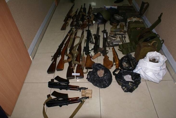 Во время санкционированных обысков в помещении, автотранспорте, гаражах задержанных обнаружены и изъяты пистолет-пулемет "ЧЗ", два АКС-74У, пистолет ТТ, 86 гранат, семь винтовок Мосина и один обрез винтовки, три десятка артиллерийских снарядов калибра 30 мм, более четырех килограммов тротила и гексогена, четыре пулемета Дегтярева, дымовые шашки, штык-ножи, приборы для определения расстояния, восемь касок, большое количество запасных частей и патронов к указанному оружию, два флага РФ.