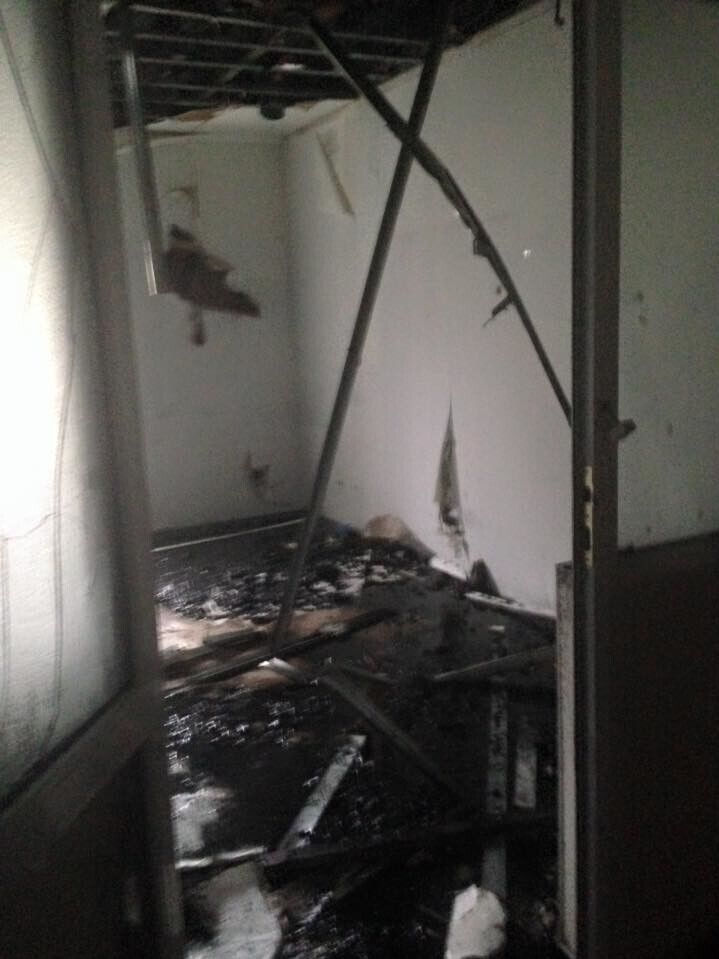 Активистка волонтерского центра Наталья Пранжу сообщила в Facebook, что офис волонтеров сильно поврежден огнем.