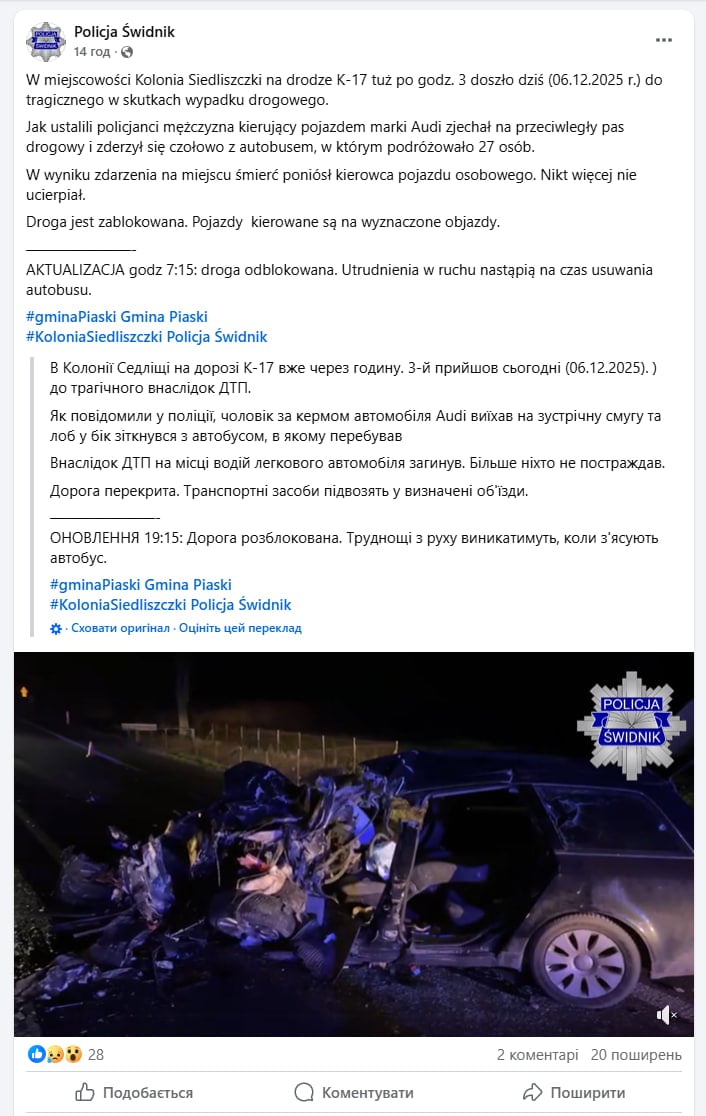 Польское медиа Radio Lublin написало, что попавший в ДТП автобус двигался из Равы-Русской (Львовская область, Украина) в Варшаву. В результате столкновения с авто он съехал с трассы. В салоне автобуса находились 27 граждан Украины. Никто из них не пострадал.