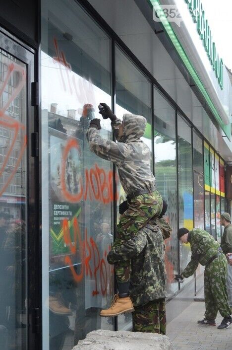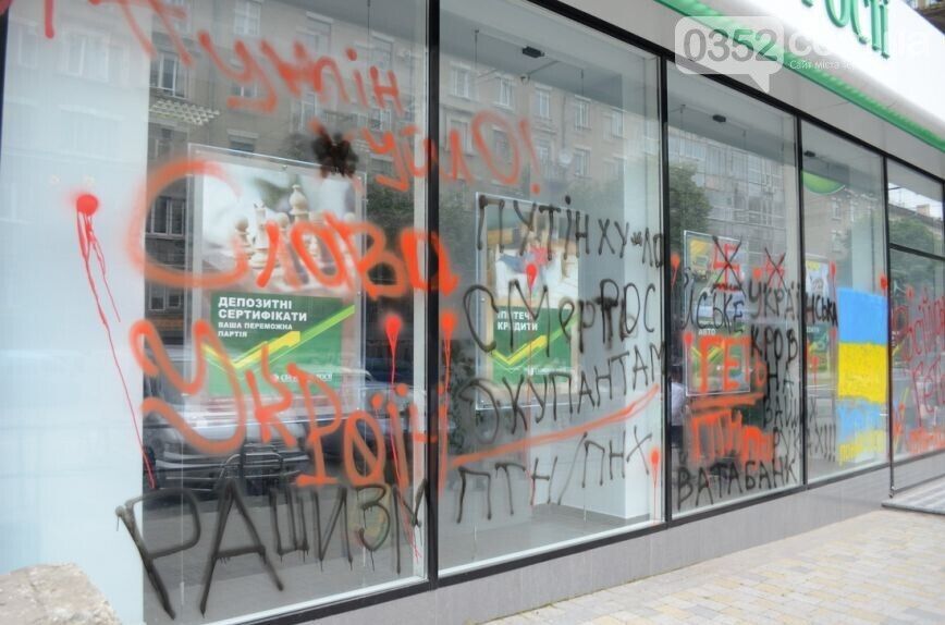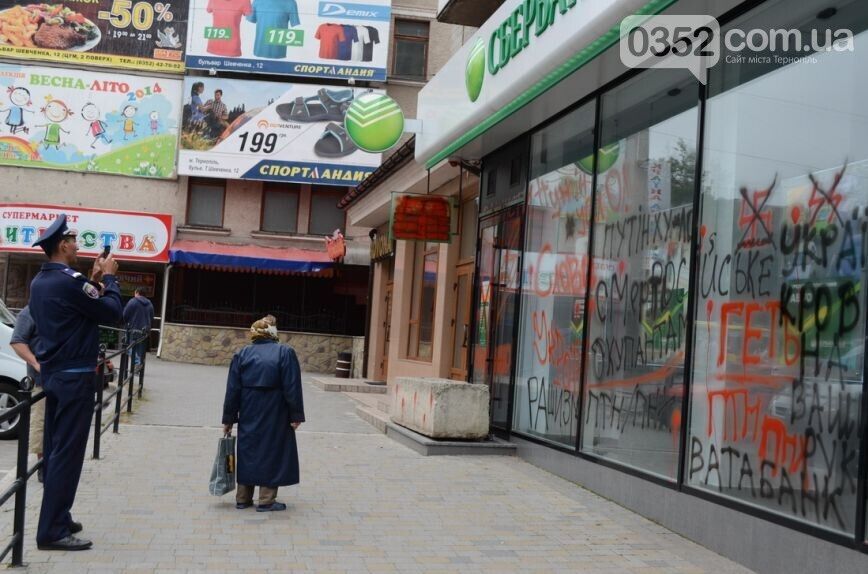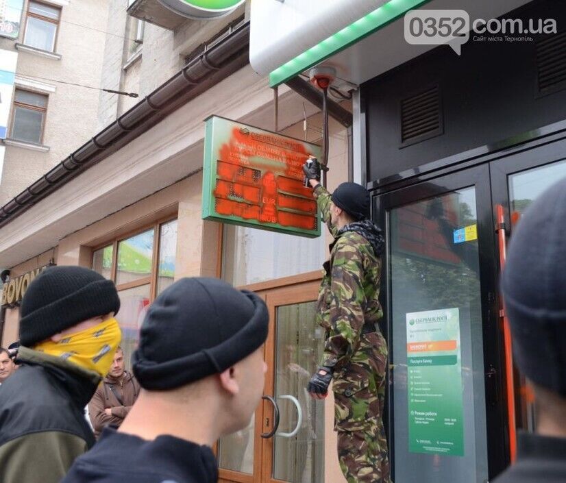 Несколько десятков представителей тернопольской Самообороны и Автомайдана разрисовали краской два отделения Сбербанка России на улицах Живова и Острожского, сообщает местный портал 0352.ua.