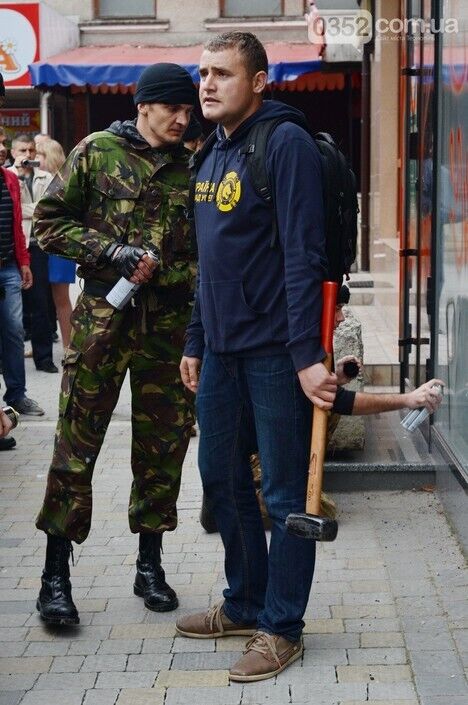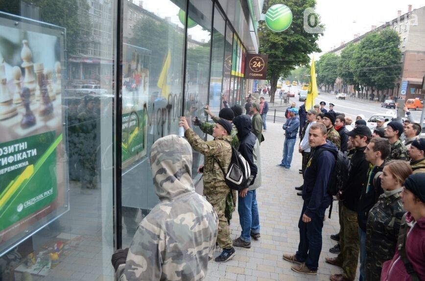 "Сбербанк нагло залез на наш рынок, работает, и через него происходит финансирование терроризма. Мы будем блокировать работу двух отделений, пока этот банк не уйдет из нашего города", – заявил комендант Самообороны Тернополя Иван Ковалик.