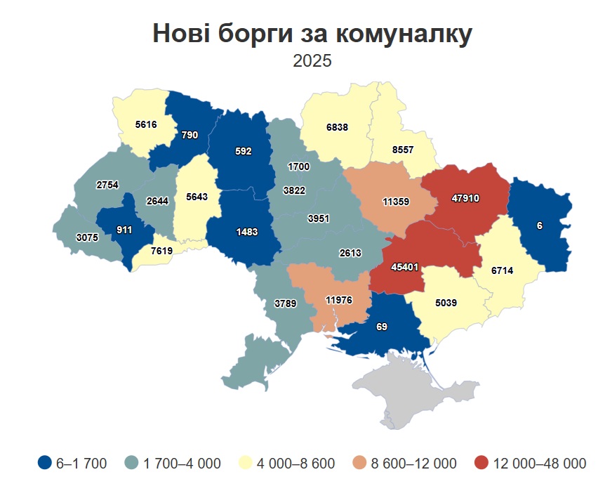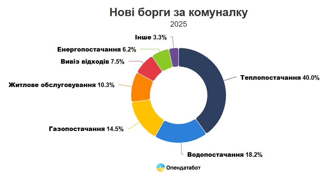 "794 604 активных долга за коммунальные услуги насчитывают в Украине по состоянию на начало ноября 2025 года. [...] 194 тыс. новых производств за коммунальные долги уже было открыто в этом году. Из них две трети до сих пор остаются открытыми (132 578 производств)", – говорится в сообщении.