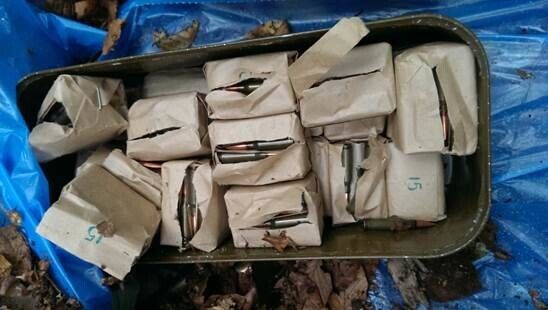В лесном массиве обнаружен тайник, в котором находились две противотанковые гранаты, почти сотня ручных гранат, 15 тыс. патронов разного калибра, снаряды для гранатомета, пороховые заряды и тротиловые шашки.