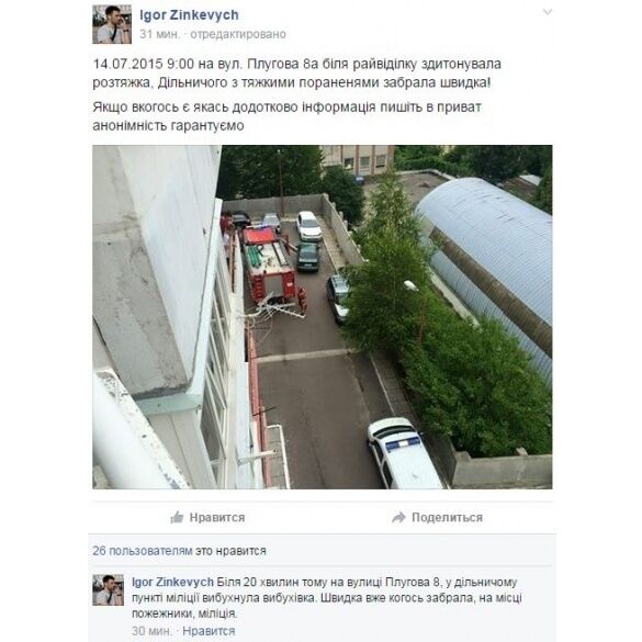"Только что на улице Плуговой возле райотдела сдетонировала растяжка. Участкового с тяжелыми ранеными забрала "скорая", – написали активисты.