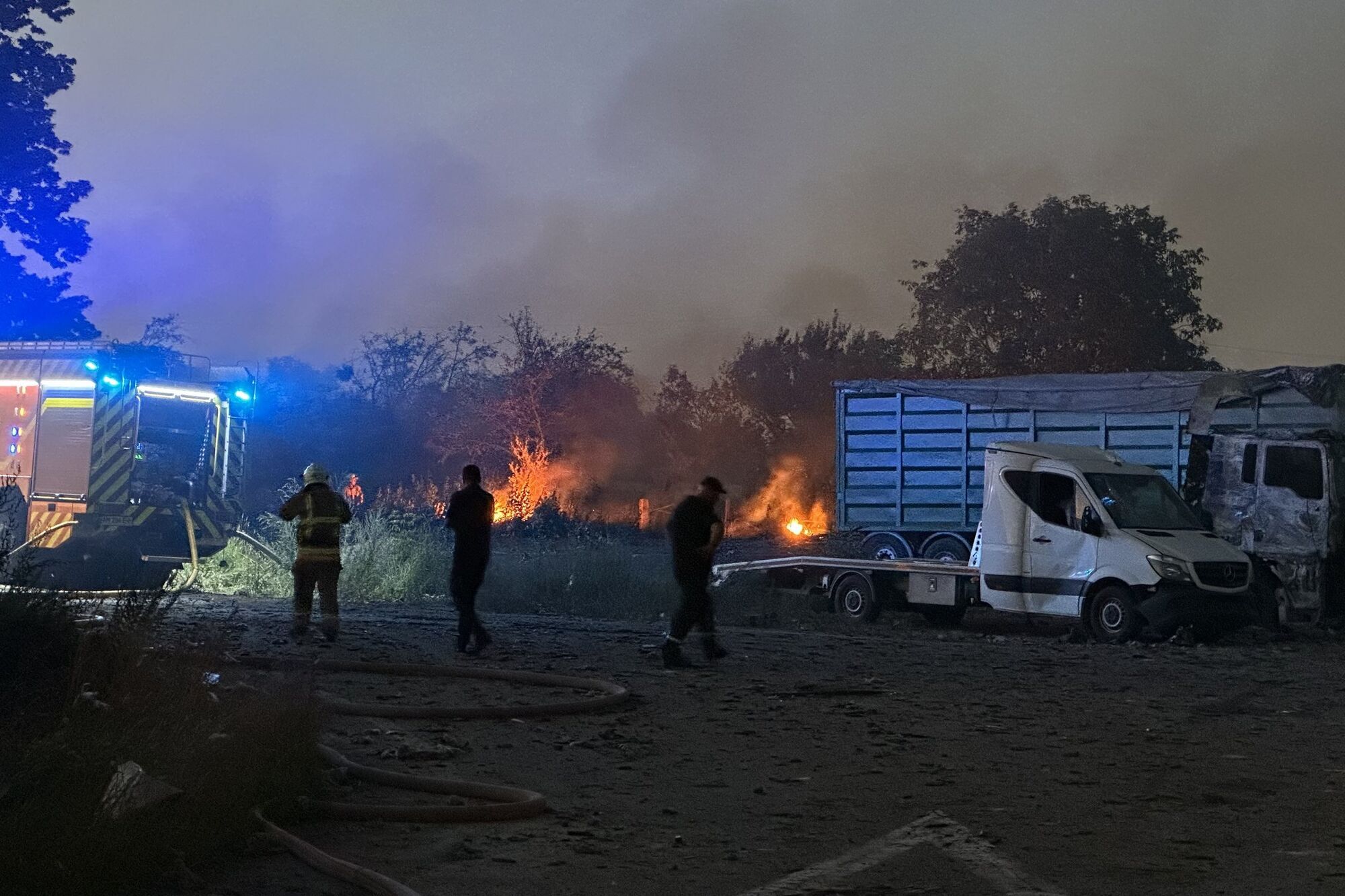 "Суспільне" также показало фото с места происшествия, на них изуродованные автомобили, поврежденные взрывными волнами дома и пожары, с которыми и в сумерках продолжают бороться спасатели.