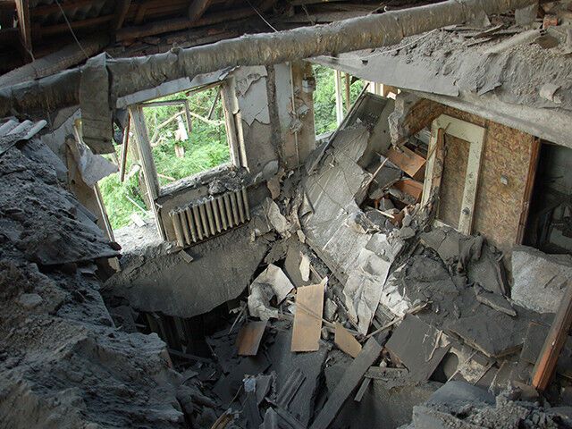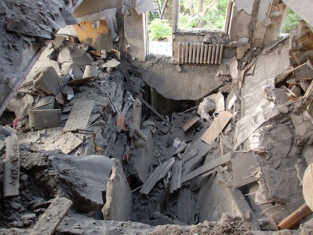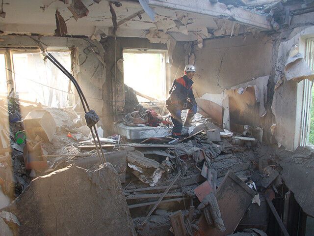 Взорвались два верхних этажа первого подъезда дома. Балкон на пятом этаже снесен, крыша над местом взрыва провалилась. Взрывной волной были выбиты стекла в соседних домах.