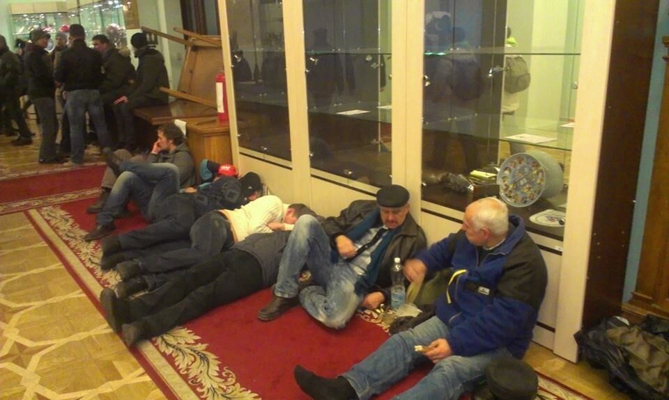 С 22.00 в КГГА усилили меры безопасности – опасаются провокаций со стороны "титушек". Народная дружина будет пропускать в здание лишь тех, кому необходимо согреться, получить медпомощь или поесть. На лестничных пролетах дежурят активисты, они забаррикадировали проходы мебелью. В фойе колонного зала многие рассматривают музей подарков мэрии – кубки, сувениры и прочее.
