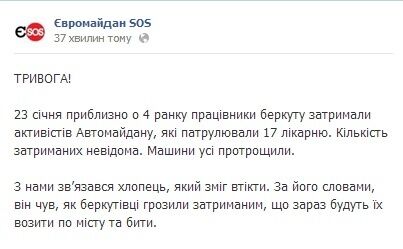 Около 4:00 беркутовцы задержали активистов Автомайдана, которые патрулировали 17 больницу в Киеве.