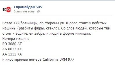 "Сегодня ночью организованы провокации против Автомайдана. 2 серых автобуса без номерных знаков ездят по Киеву, из них выходят люди в форме Беркута, и бьют припаркованные автомобили киевлян. За ними следует три легковых автомобиля (серый Ланос с шашкой такси, две Сузуки Гранд Витара, один из них с номером АИ ВН 7379), в которых находятся люди в штатском, которые арестовывают подъезжающих на эти события активистов", - предупреждают активистов Автомайдана на странице "Євромайдан SOS".
