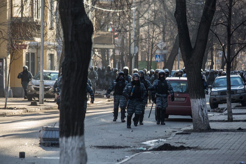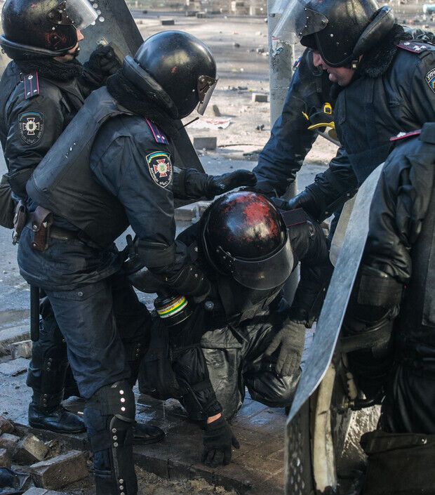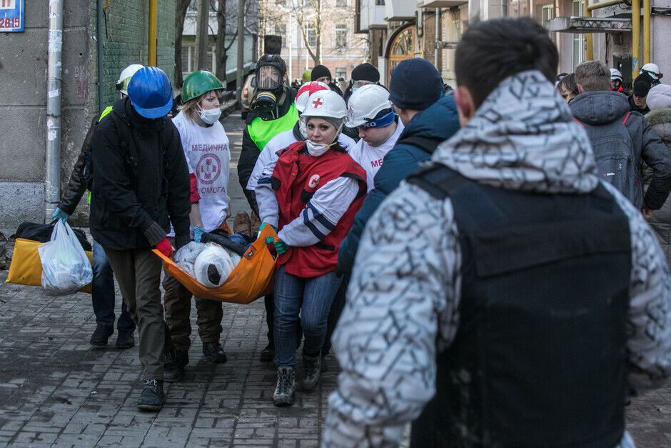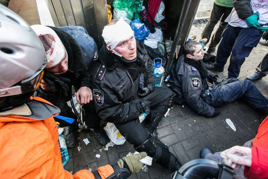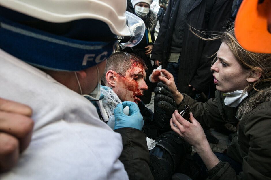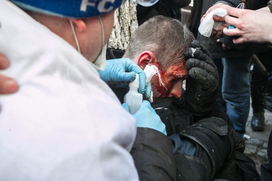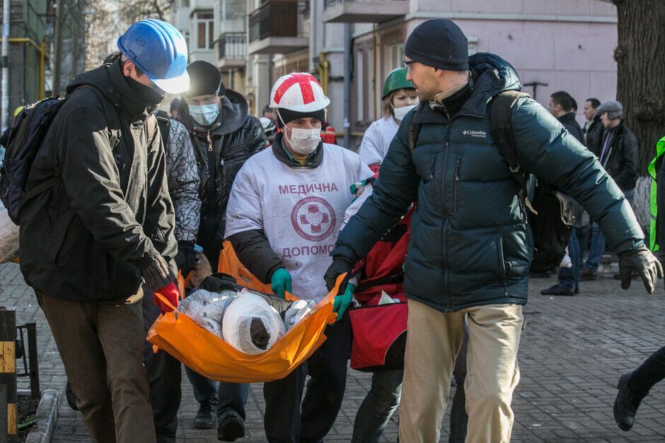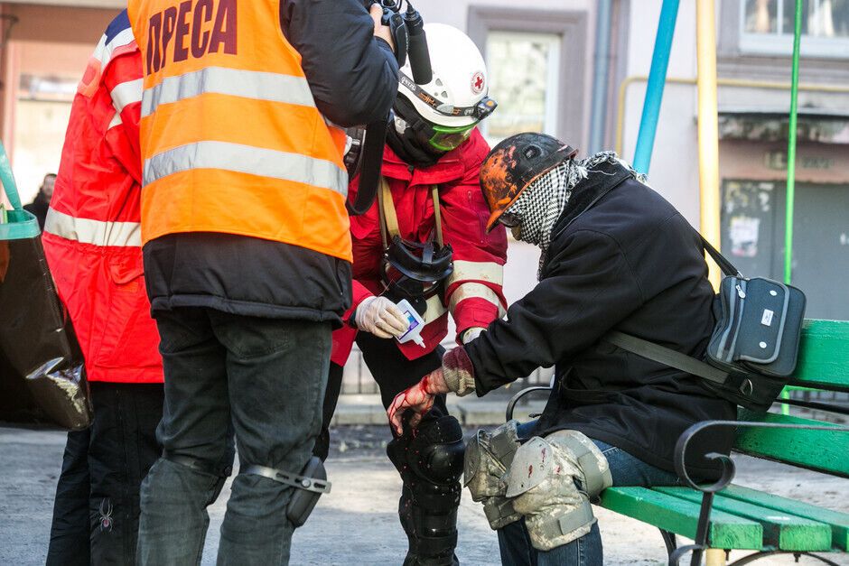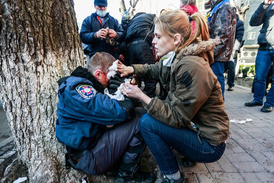 18 февраля в правительственном квартале прошли ожесточенные стычки между евромайдановцами и представителями силовых структур. Силовики использовали свето-шумовые и газовые гранаты, а также помповое оружие. Митингующие в ответ забрасывавали правоохранителей камнями. Медики Евромайдана помогали пострадавшим с обеих сторон.