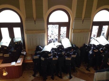 В холле облгосадминистрации примерно 20-30 бойцов никого не пускали внутрь здания. Митингующие, которым удалось туда попасть, пытались отбирать у них щиты. Полиция применила слезоточивый газ.