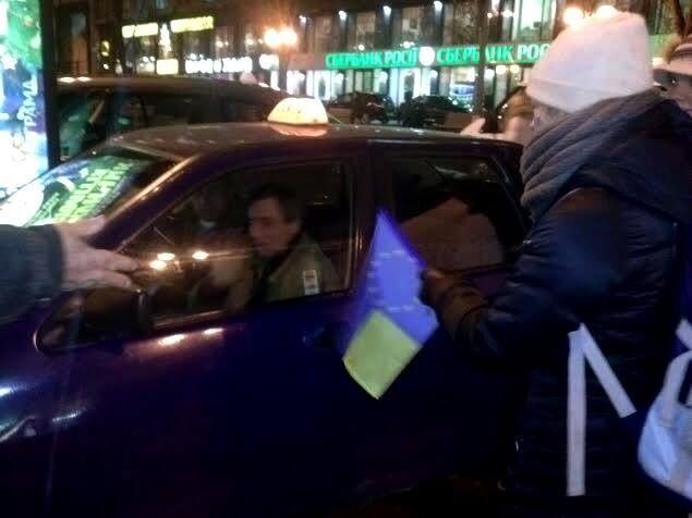 17.37. Активисты Евромайдана раздают проезжающим мимо автомобилистам флаги Украины и ЕС.