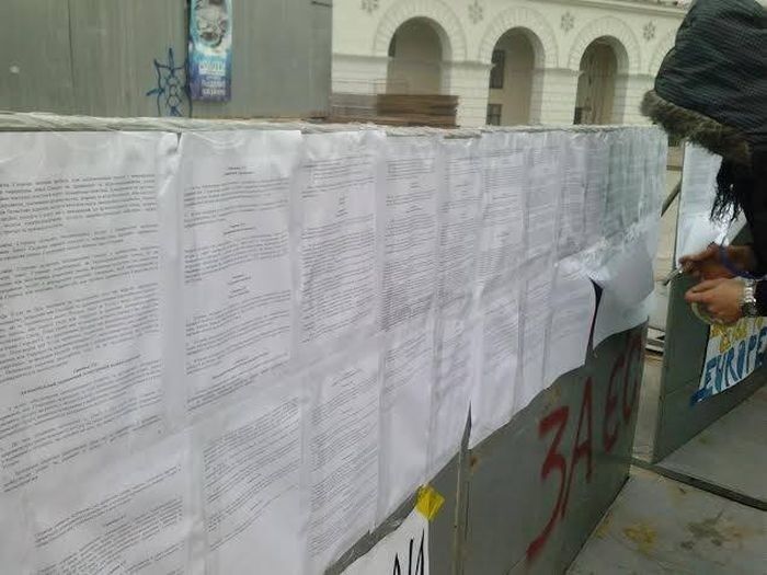 14.24. Вдоль забора вокруг Евромайдана активисты расклеили полный текст Соглашения об ассоциации.