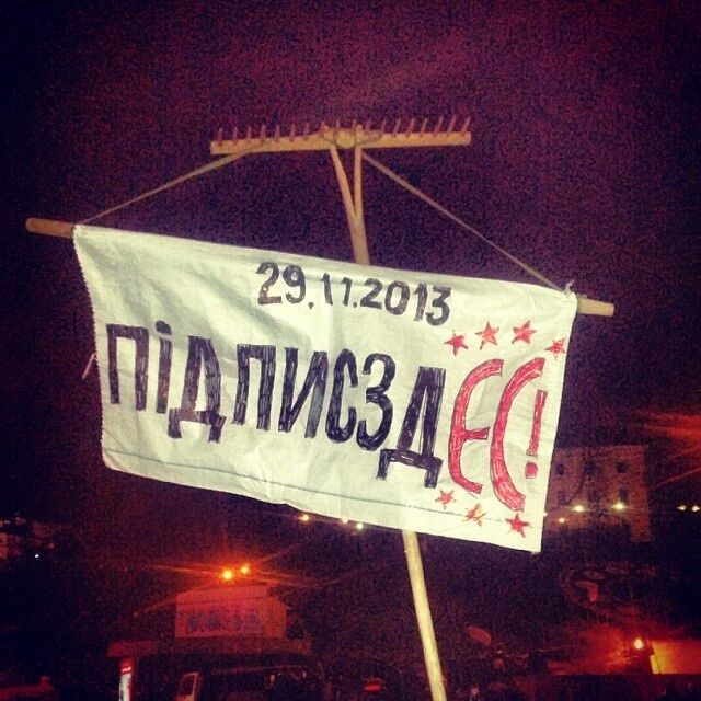 Януковичу, который соглашение решил не подписывать, Майдан скандирует "Ганьба!" и "Подпиши, подпиши!".19.30 Возле выхода из подземного перехода на Майдане бесплатно раздают синие и желтые ленточки.