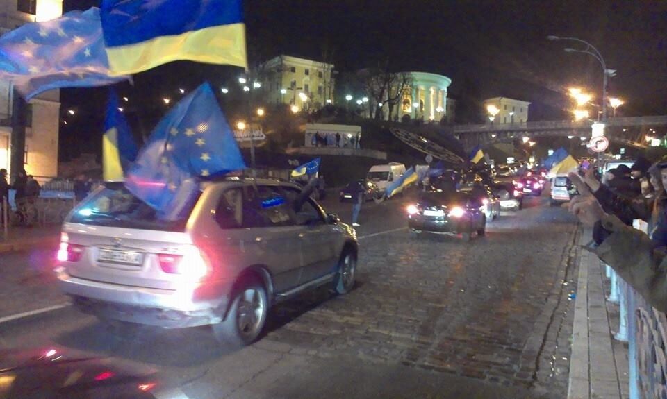 21.37 На Майдане Незалежности продолжается митинг в поддержку ассоциации с ЕС. По Крещатику и улице Институтской проехала колонна автомобилей с флагами Евросоюза и Украины. Автомобилисты сигналили и приветствовали участников митинга.
