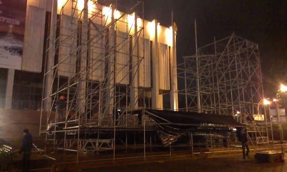 21.19 Как передает наш корреспондент, на Европейской площади рабочие возводят сцену.