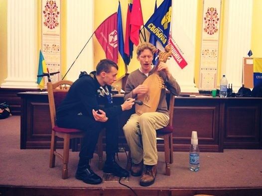 23.44 Кобзарь поднимает боевой дух активистов.