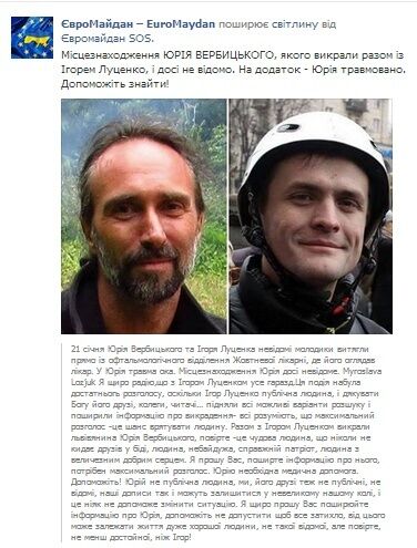 "Вместе с Игорем Луценко похитили львовянина Юрия Вербицкого, поверьте – это замечательный человек, который никогда не бросает друзей в беде, человек неравнодушный, настоящий патриот, человек с огромным добрым сердцем. Юрию необходима медицинская помощь", – написал участник сообщества.