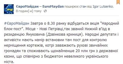 Сегодня активисты планируют установить возле поворота на село Новые Петровцы, рядом с которым расположено "Межигорье", "народный блокпост".