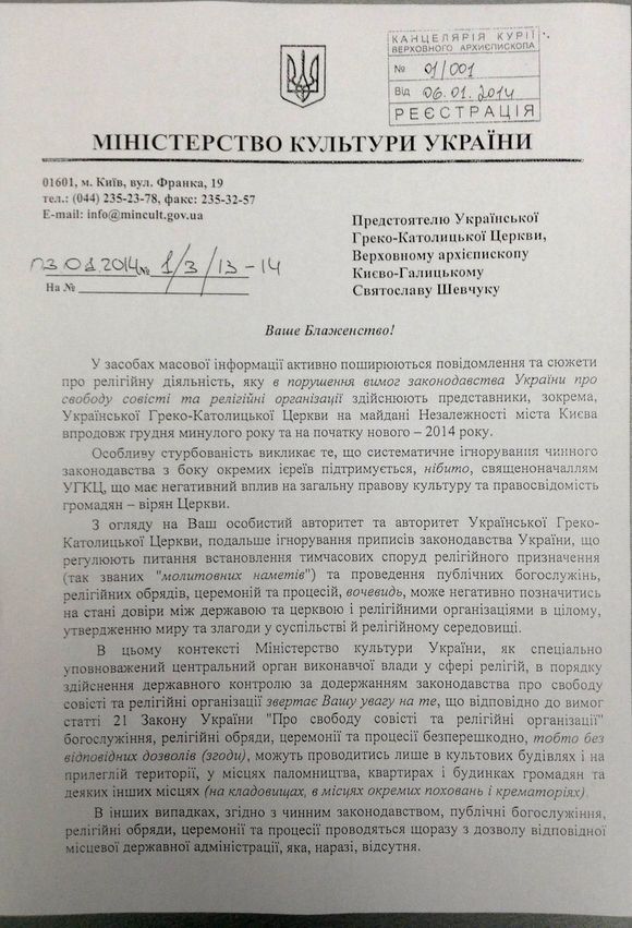 УГКЦ в рождественские праздники получила письмо из Министерства культуры, в котором отмечалось, что представители церкви "осуществляют на Майдане Незалежности религиозную деятельность, нарушающую законодательство Украины о свободе совести и религиозных организаций".
