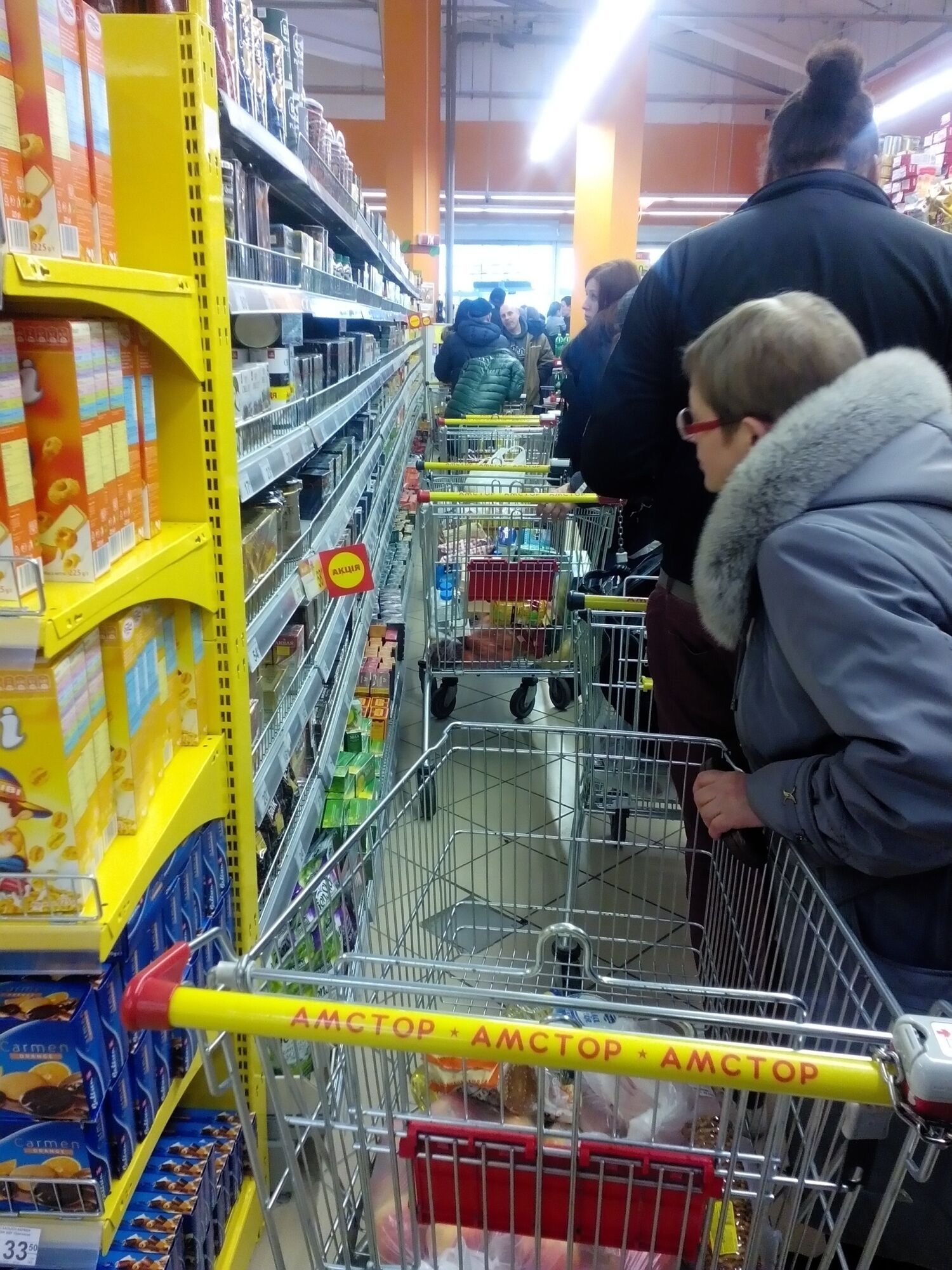 В магазинах выстроились огромные очереди, на кассы в супермаркетах выстроились покупатели по 40-50 человек.