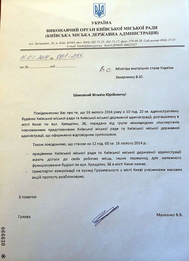 Председатель Киевской горгосадминистрации Владимир Макеенко направил обращения и.о. министра внутренних дел Виталию Захарченко и генеральному прокурору Виктору Пшонке, в которых сообщил, что протестующие освободили помещения КГГА.