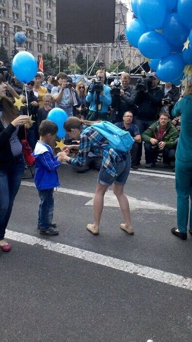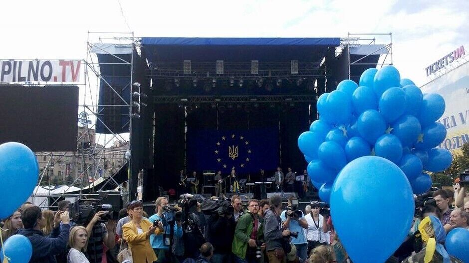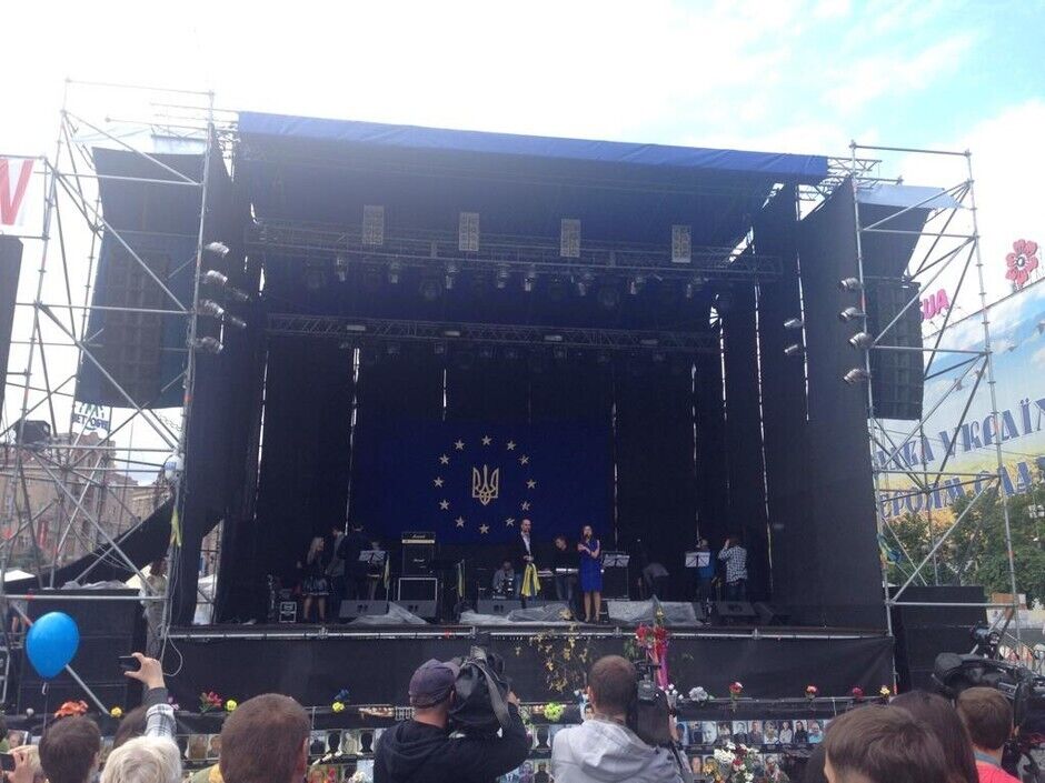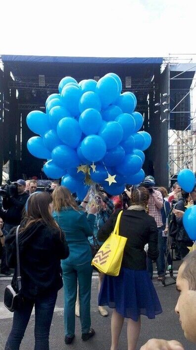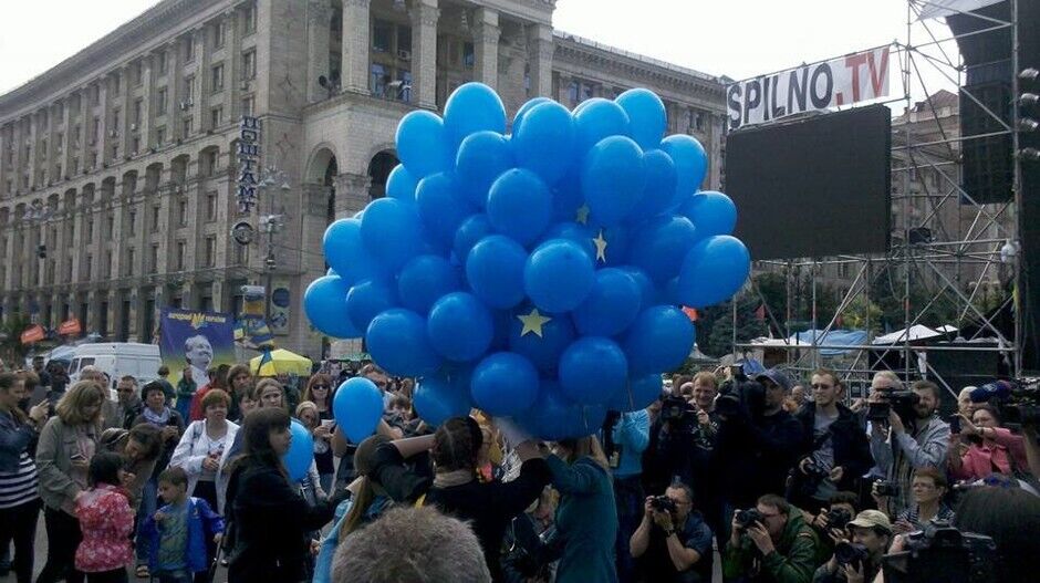 Несколько сотен человек собрались на Майдане Незалежности в Киеве, чтобы отпраздновать сегодняшнее подписание Соглашения об ассоциации между Украиной и ЕС. Собравшиеся исполнили гимны Украины и Евросоюза ("Оду к радости"), а также запустили в небо синие шарики с желтыми звездочками.