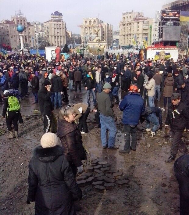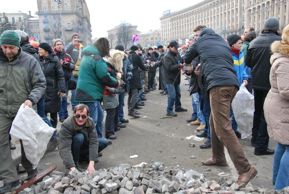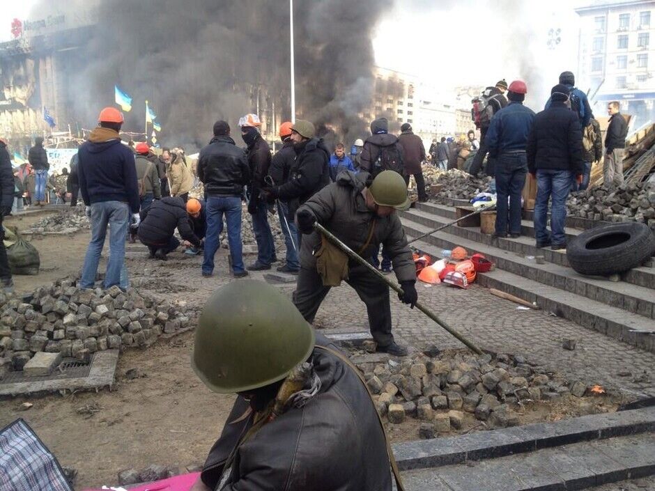 В центре Киева протестующие готовятся к очередному штурму силовиков. Активисты, среди которых много женщин всех возрастов, практически полностью разобрали брусчатку на Майдане Незалежности, а также обе стороны проезжей части улицы Крещатик: от Дома профсоюзов до Главпочтамта.