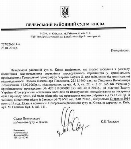 Однако позже, уже после побега Януковича, Генпрокуратура возобновила уголовные производства. 2 марта Печерский районный суд Киева запретил Попову покидать пределы Украины и обязал сдать загранпаспорт.