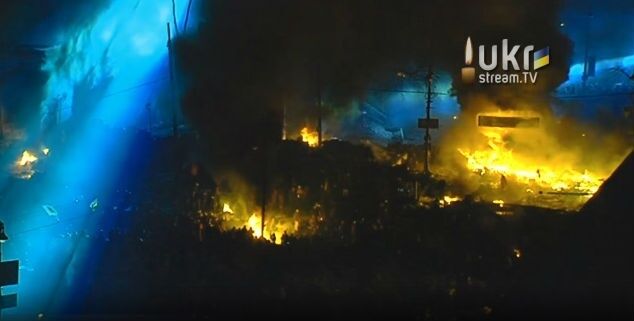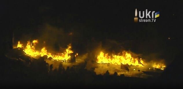 17.38 На Грушевского пока спокойно. Иногда митингующие поджигают шины.