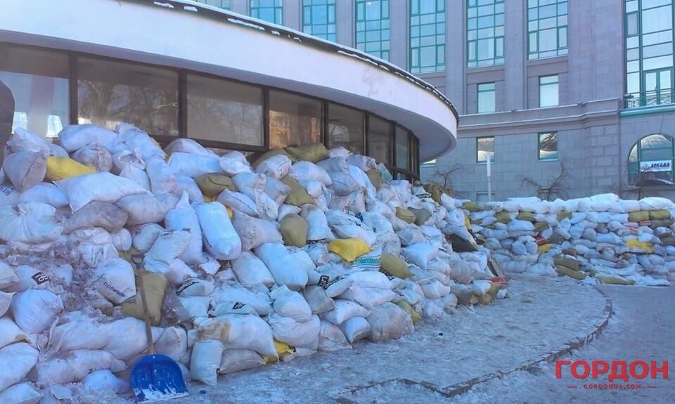 10.33 Активисты продолжают расширять периметр баррикад на Инстутской возле верхнего выхода метро Крещатик. Заграждения обложили мешками со снегом.
