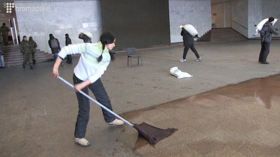 04.43 Активисты убирают Украинский дом после милиционеров.